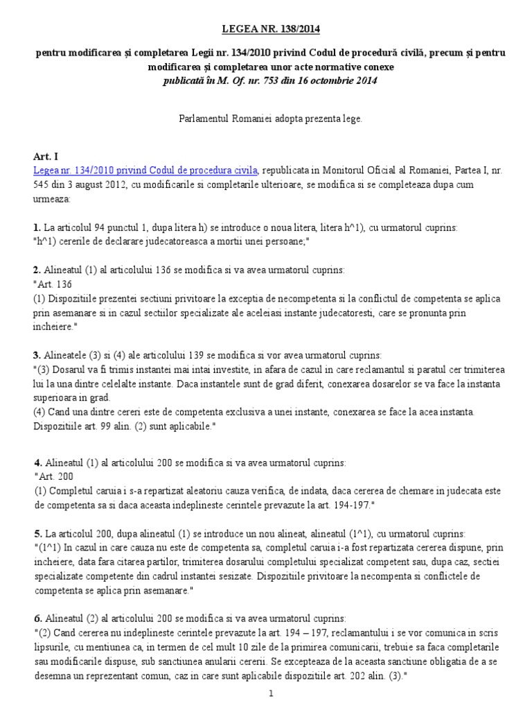 Legea Nr 138 2014 Modificarea Si Completarea Legii Nr 134 2010 Codul De Procedura Civila Precum Si Pentru Modificarea Si Completarea Unor Acte Normative Conexe