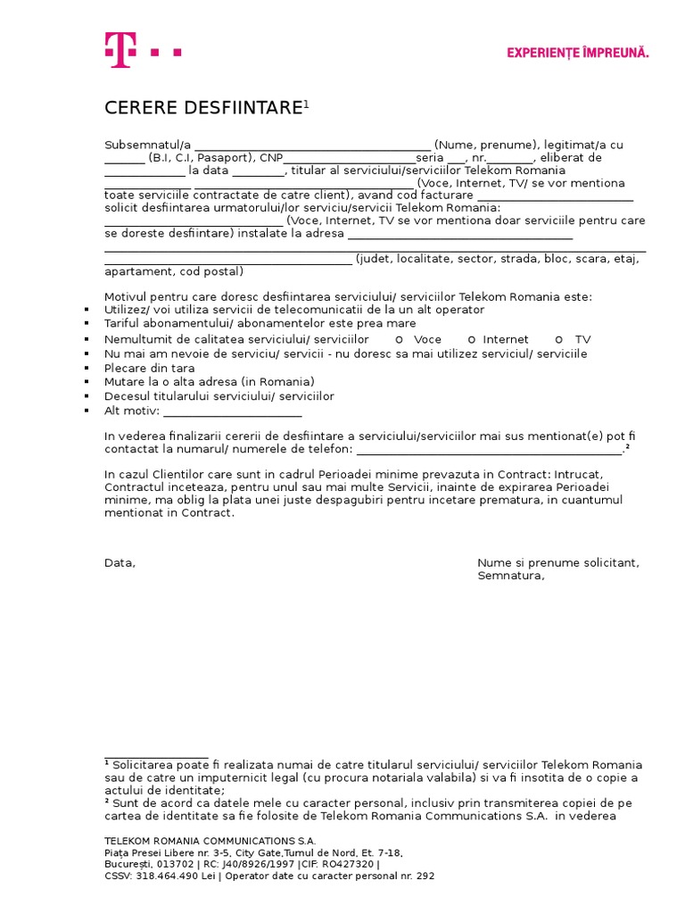 Cerere Reziliere Desfiintare Client Persoana Fizica Telekom Romania T