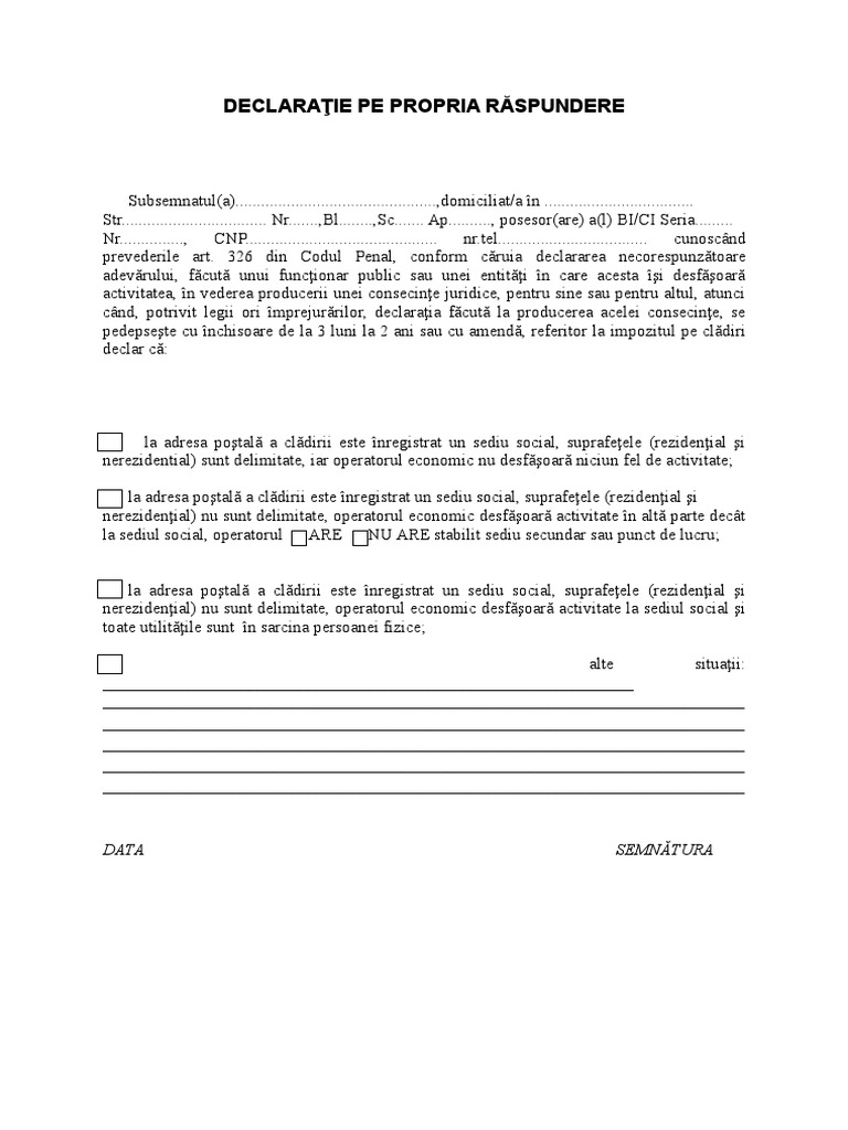 Model Declaratie Proprie Raspundere Taxe Locale 2 Doc