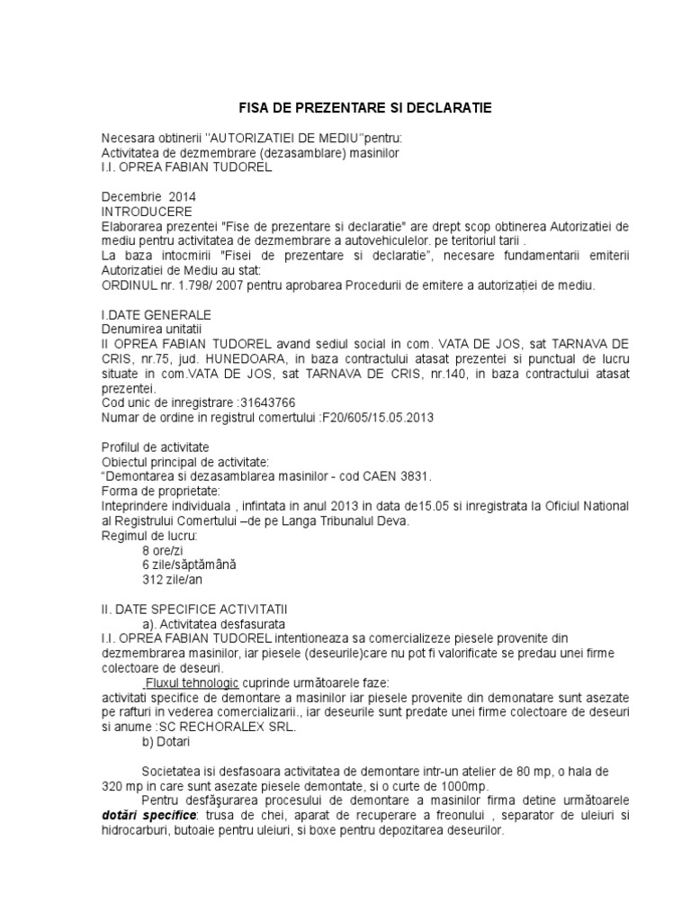 Fisa De Prezentare Mediu Dezmambrari Auto