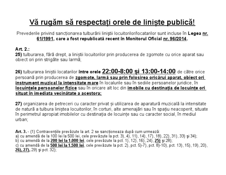 Monitorul oficial ore de liniste. Mai exact pentru cei care şi deranjează în mod repetat vecinii în 24 de ore amenzile sunt cuprinse între 500 şi 1 500 de lei. 61 1991 republicata 2011 pentru sanctionarea faptelor de incalcare a unor norme de convietuire sociala a ordinii si linistii publice a fost republicata in monitorul oficial partea i nr. Modificări majore la orele de liniște ce trebuie respectate de către români au fost adoptate astăzi de senat printr un proiect de act normativ. Orele de liniste sunt impuse de primarie.